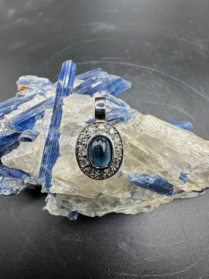 Ein klassischer, zugleich edler Anhänger, der mit seiner harmonischen Form und hochwertigen Edelsteinen eine zeitlose Wirkung entfaltet. Gefertigt aus 14 Karat (585) Weißgold, auf Hochglanz poliert, bietet er die perfekte Bühne für die kühlen Farbtöne des Saphirs und das helle Feuer der Brillanten.
