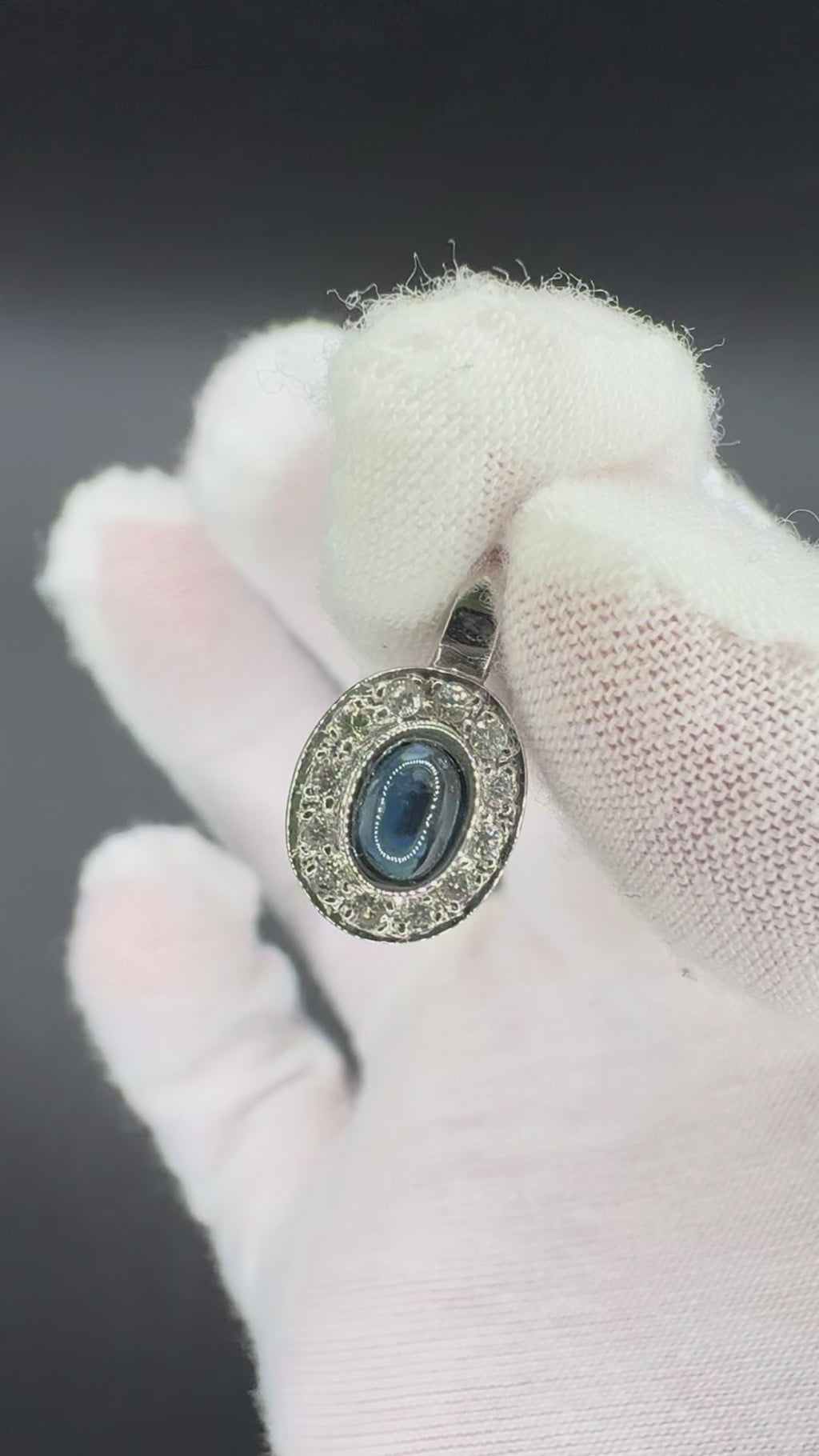 Im Zentrum sitzt ein blauer Saphir-Cabochon von 0,45 Karat, weich gewölbt und in einer schlichten Zargenfassung gehalten. Seine Farbe wirkt klar, lebendig und wird durch das helle Weißgold wunderbar hervorgehoben.