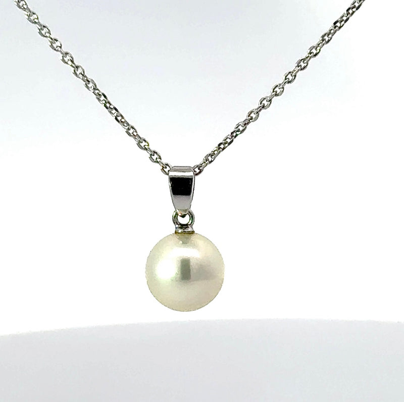 Ein zeitloser Perlanhänger in 14 Karat (585) Weißgold, der Eleganz und Alltagstauglichkeit perfekt verbindet. Das kühle, hochglanzpolierte Weißgold bildet die ideale Bühne für die feine weiße Süßwasserperle, die mit ihrem 8,8 mm Durchmesser und einem zarten grünlich-rosa Lüster besonders edel wirkt. Die Perle liegt weich und angenehm auf der Haut und zeigt eine ruhige, klassische Ausstrahlung, ohne aufdringlich zu sein.