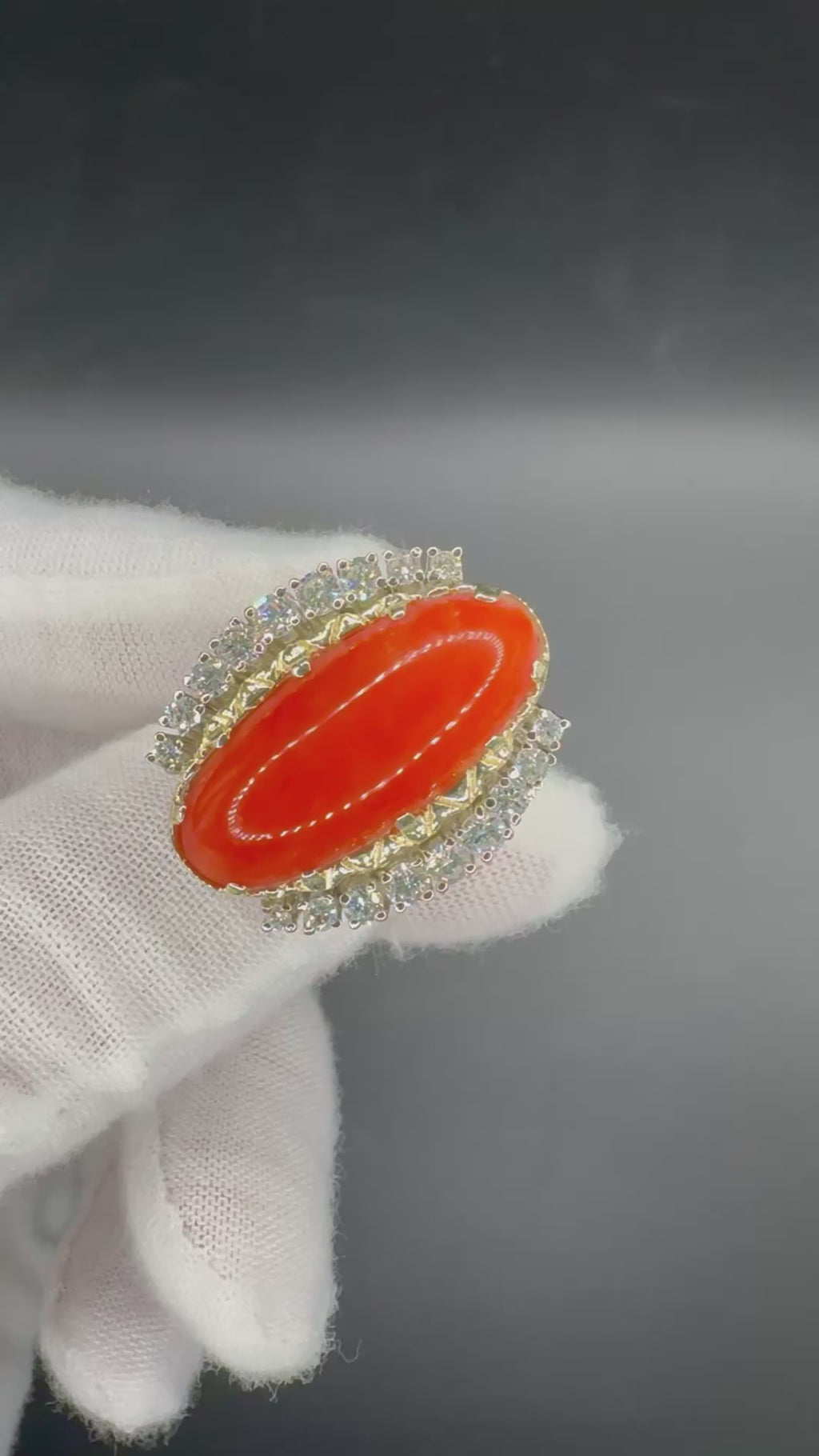 Ein einzigartiger, ausdrucksstarker Cocktailring mit großer Koralle und brillanten Akzenten – ein wahrer Blickfang für Liebhaber hochwertiger, handgefertigter Schmuckkunst.