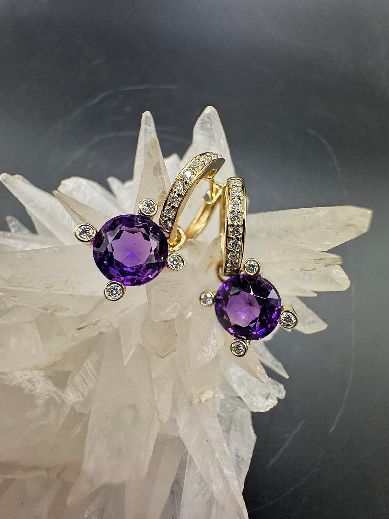 Diese modernen, äußerst stilvollen Ohrringe vereinen edles Gelbgold, lebhafte Edelsteine und anspruchsvolle Fasskunst zu einem wirkungsvollen Gesamtbild. Als Oberteil wurden brillantbesetzte Kreolen gearbeitet, die durch ihre klare Form und das strahlende 14 (585) Karat Gelbgold bereits für sich sprechen. Sie sind beweglich mit dem unteren Element verbunden – einer kraftvollen Bühne für die leuchtenden Amethyste –, wodurch beim Tragen ein dynamisches Spiel aus Licht, Farbe und Bewegung entsteht. Mit 4,94 Gramm sind diese Ohrringe auch problemlos über lange Zeiträume tragbar.