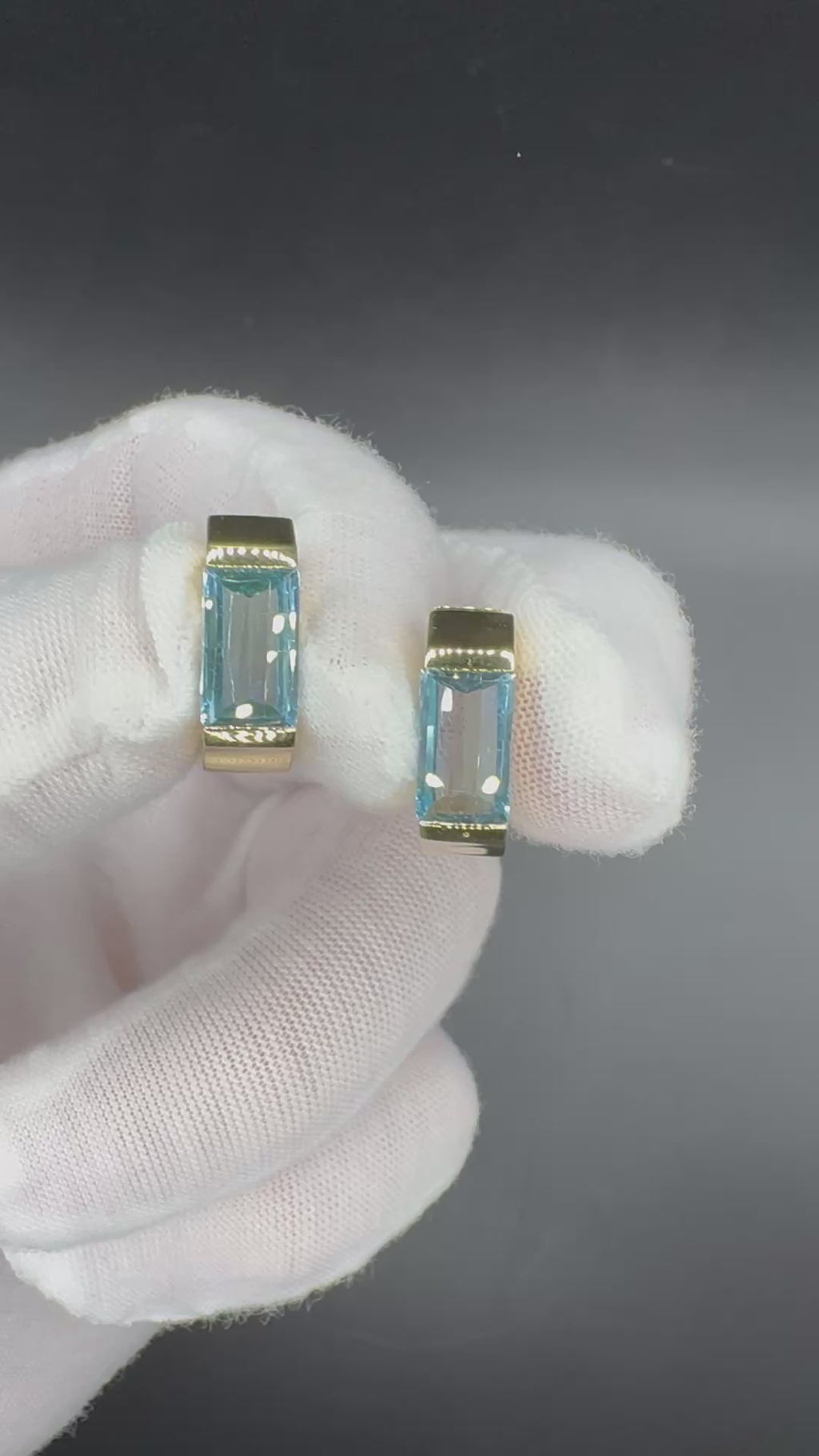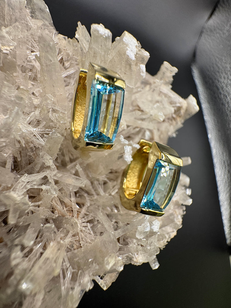 Diese modernen, kantigen Kreolen aus 14 Karat (585) Gelbgold überzeugen durch ihr harmonisches, steinbetontes Design. Die beiden Topase mit insgesamt 5,1 Karat zeigen ein faszinierendes Meerblau, das im hochglanzpolierten Gelbgold besonders intensiv wirkt. Durch den lebendigen Schachbrettschliff und den leicht bauchigen Charakter entfalten die Edelsteine ihre maximale Farbtiefe – klar, augenrein und voller Ausstrahlung.