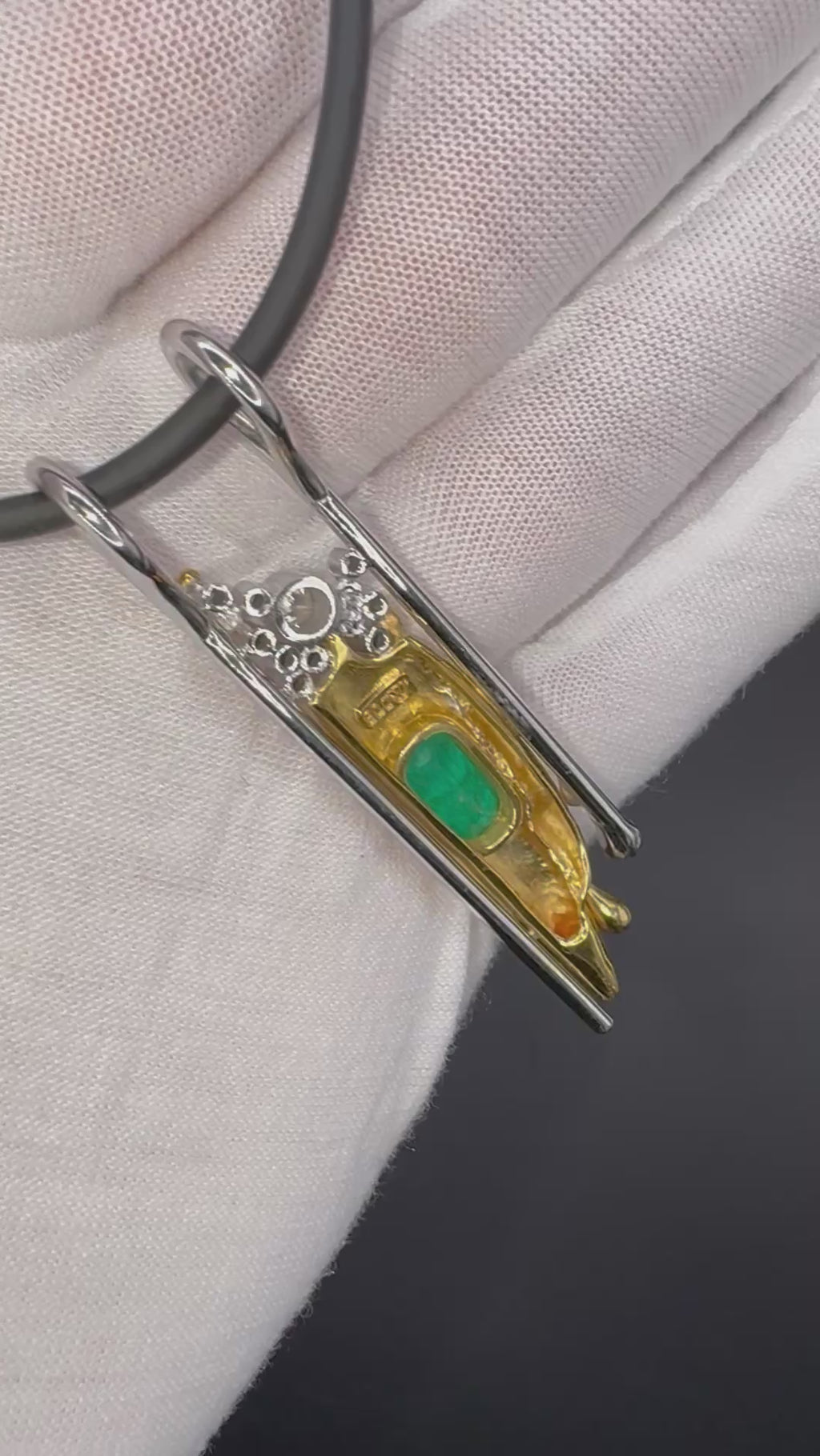 Im Zentrum steht ein Smaragd von beeindruckenden 2,21 Karat, leuchtend giftgrün, mit schöner Transparenz und charaktervoller, lebendiger Ausstrahlung. Seine elongierte Form fügt sich harmonisch in die vertikale Silhouette des Anhängers ein und wird vom warmen Gelbgold perfekt eingerahmt.